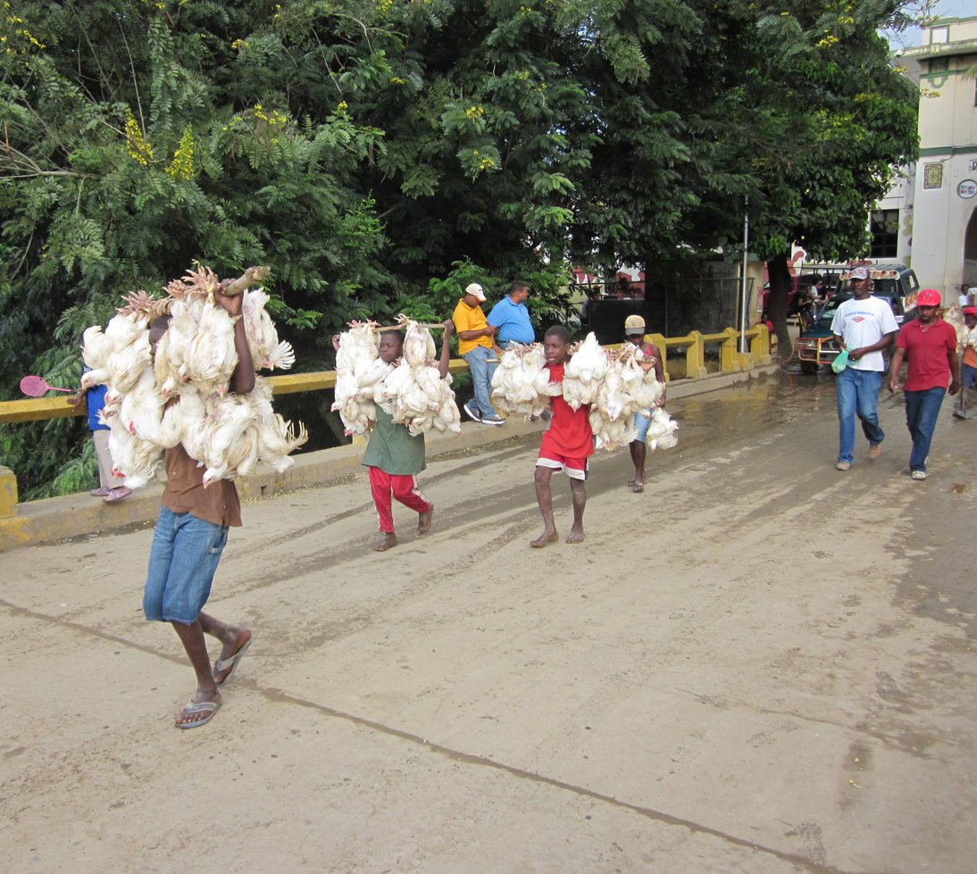 Despite what we’ve heard in the news, the border is not closed, but it’s late in the afternoon and the gate halfway down the bridge will be closing for the evening as it does each day. Foot traffic is moving predominately one way, and we watch as Haitians, mostly young men are carrying food back to their country. Live chickens are passing us by. Forty to fifty of them, tied to a stick and resting across the shoulders and necks of these boys.